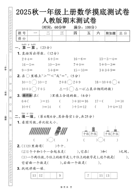 3734-一年级上数学期末押题模拟测试卷全5套《人教版》