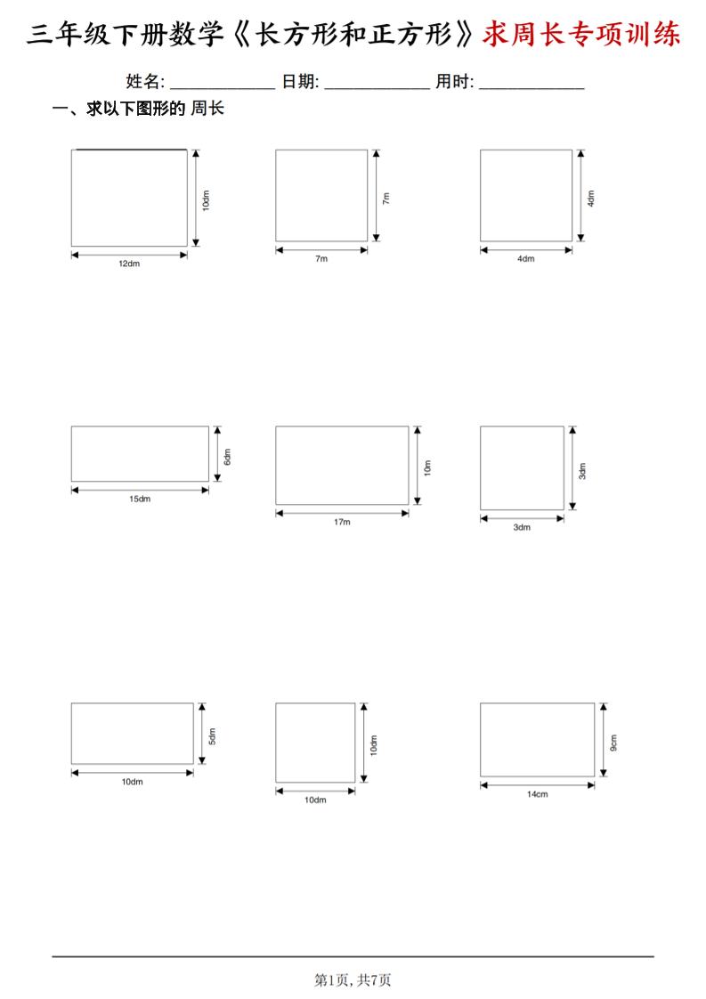三年级下数学《长方形和正方形求周长》求周长专项练习
