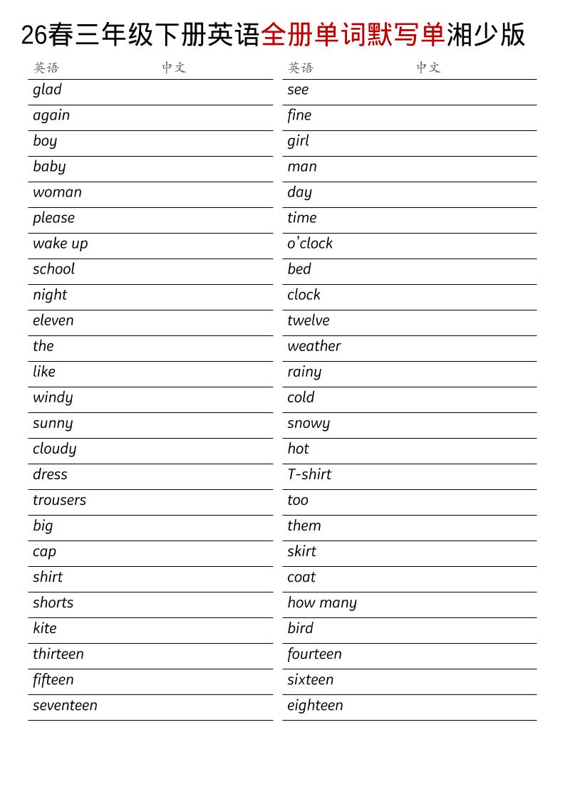 三年级下英语26春全册单词默写单《湘少版》