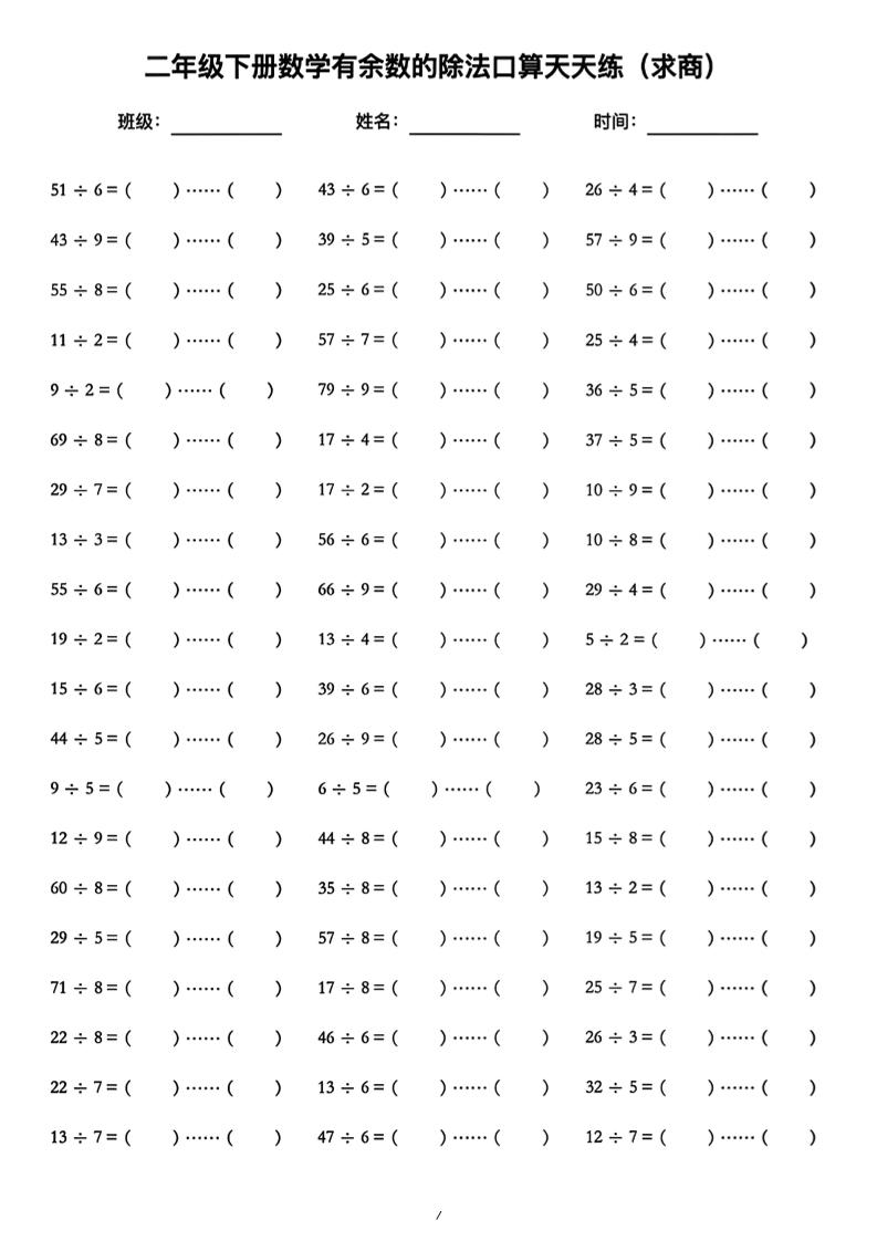 二年级下数学《有余数的除法》口算练习题(含答案)人教版
