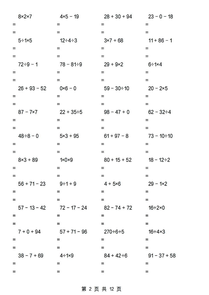 二年级下数学加减乘除混合运算专项