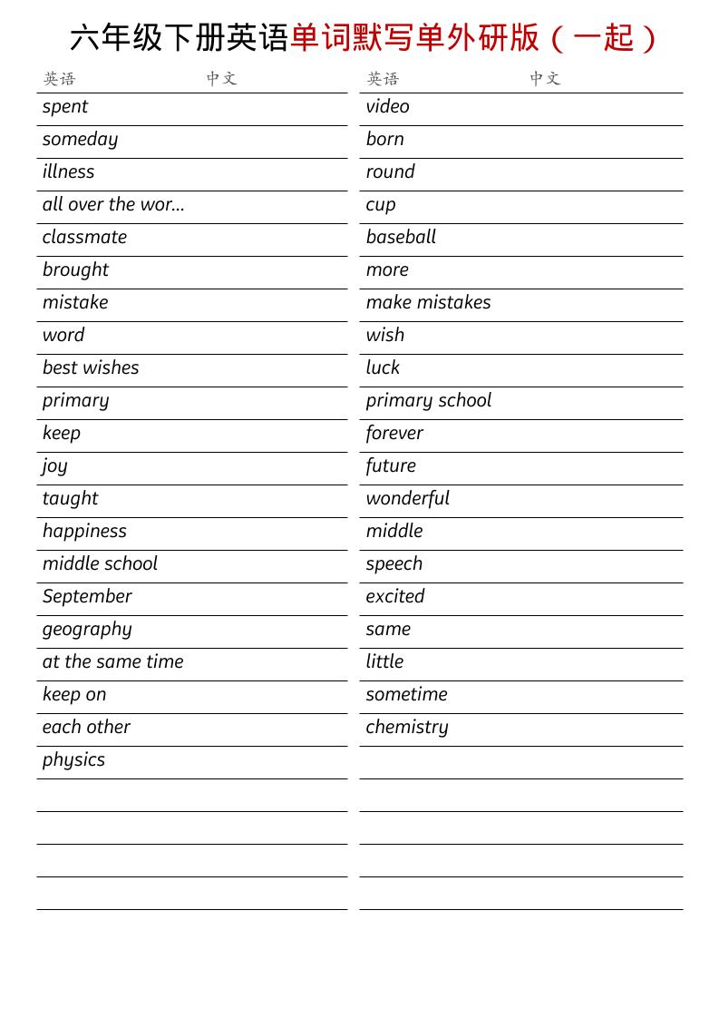 六年级下英语全册单词默写单《外研版(一起)》