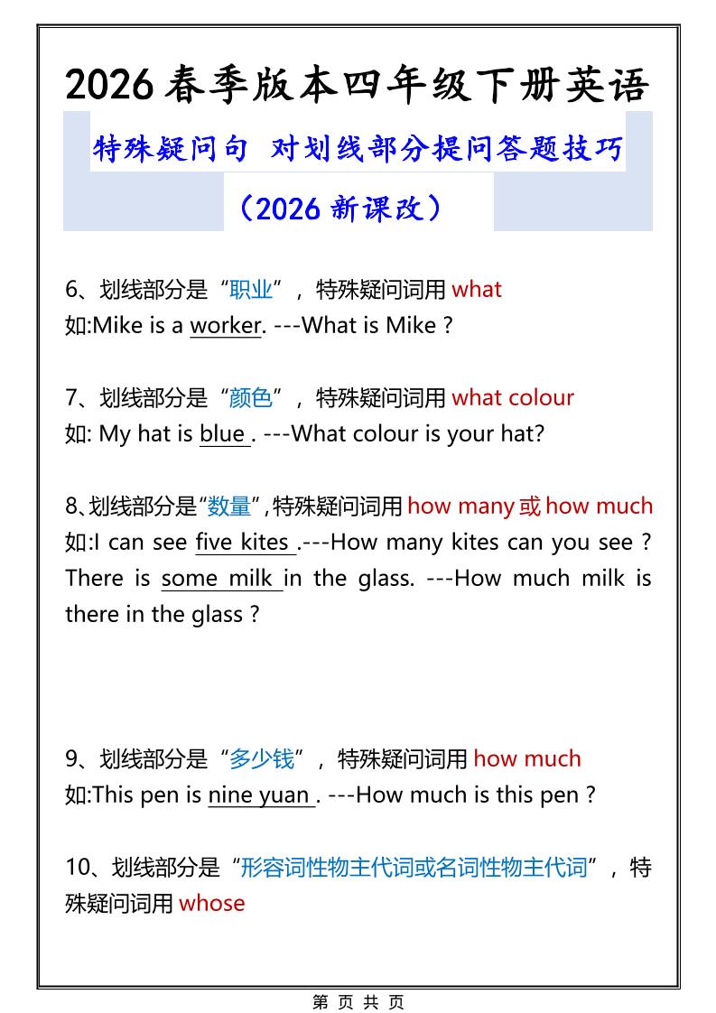 首页 > 全部 > 四年级 > 2026春新版四年级下英语特殊疑问句答题技巧