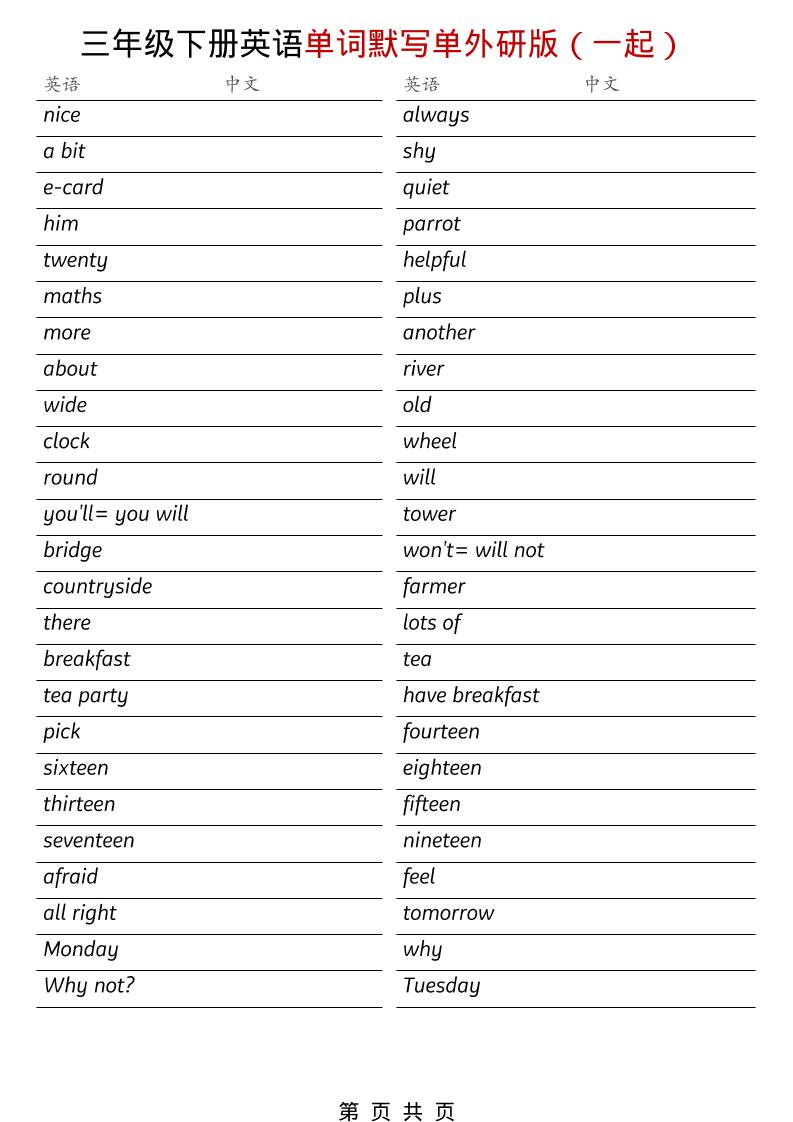 三年级下英语全册单词默写单《外研版(一起)》